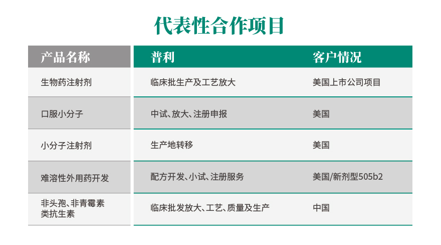提供綜合性閉環服務,支持上市后銷售,具有雙報優勢,國內、國際均可注冊,原料制劑一體化,研發及商業化產品不受原料藥限制。劑型種類豐富,包括注射劑、緩控釋制劑、口服制劑、兒童制劑、外用制劑。品種覆蓋了消化道和代謝藥物、造影劑、神經系統藥物、全身用抗感染藥物、肌肉-骨骼系統藥物、心血管藥物、呼吸系統藥物、抗腫瘤藥物、眼科藥物、皮膚用藥等十余個領域。